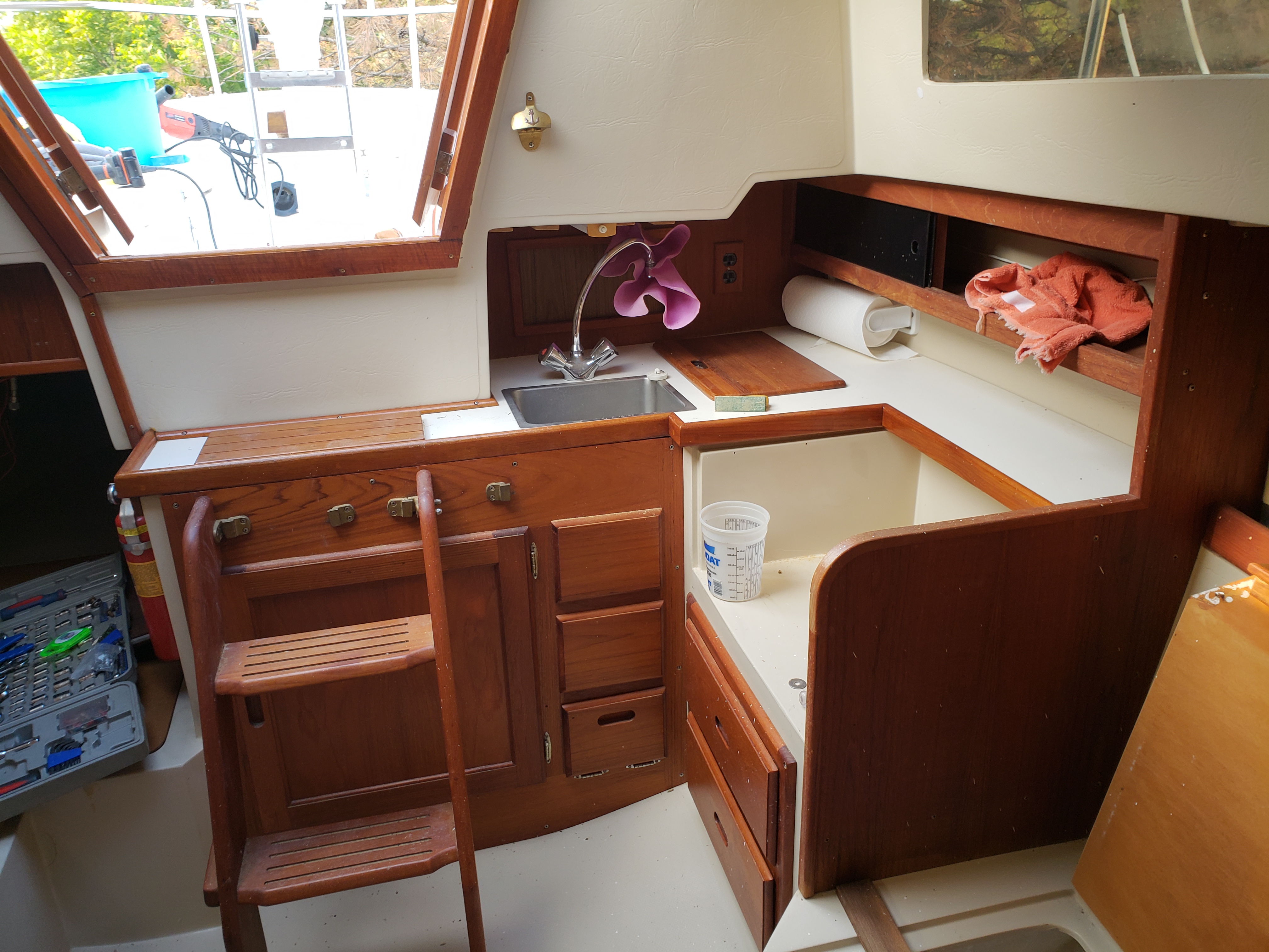 Luckily, the boat’s hull was undamaged and the outside deck and cockpit were in very good shape as well as the teak below deck. The only thing that remained in the cabin was the head, sink and stove. Jeanie and Tim eventually decided that they wanted to purchase the wayward boat, and so the work began!